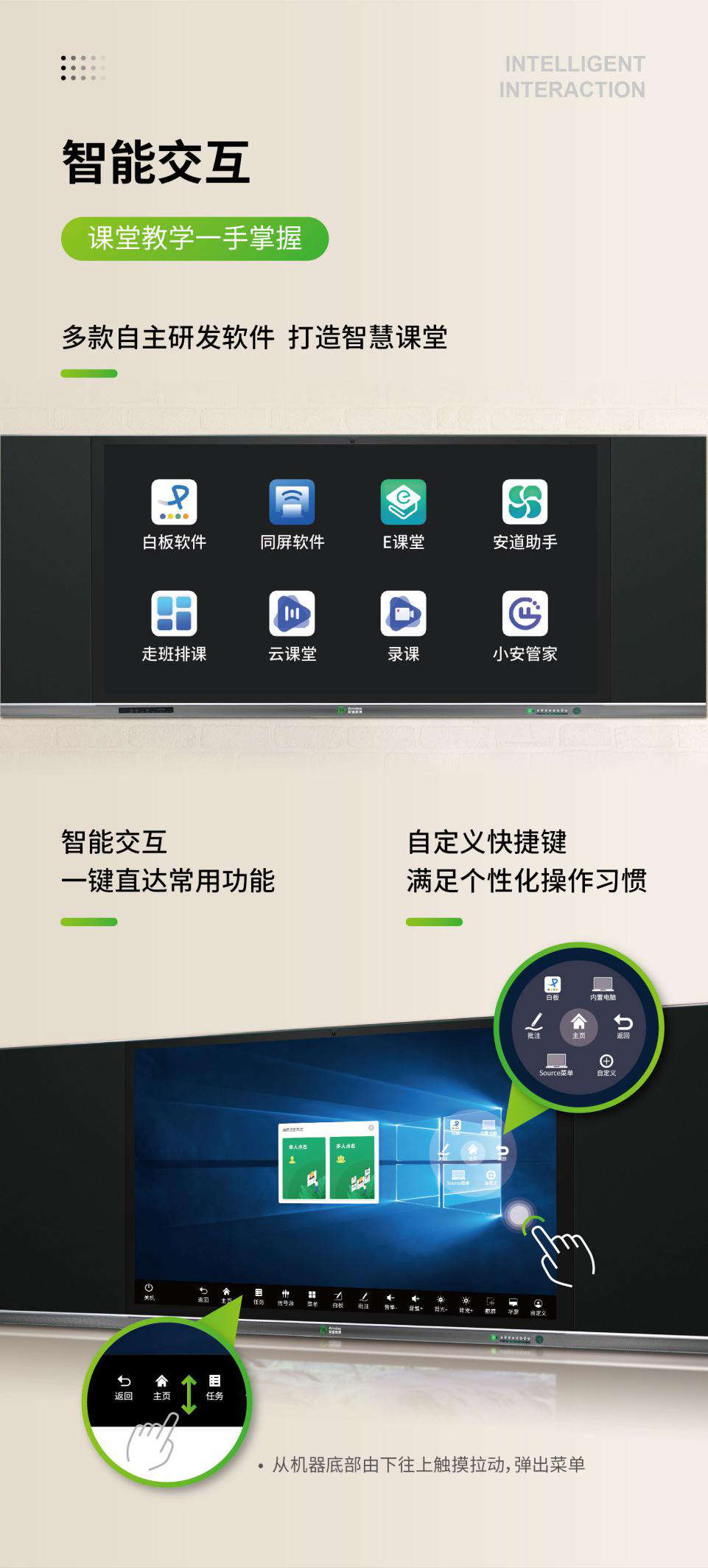 安道教育立足于廣大師生需求,把傳統教學黑板變為可感知的互動黑板,為此推出的全新外觀的納米智慧大屏黑板,通過納米觸控技術有效地將傳統教學與現代多媒體教學進行有機結合,實現傳統教學黑板與只能電子觸控大屏的無縫切換,既保留了傳統書寫的習慣,又嵌入全新智能交互大屏,讓教師與學生成為課堂教學主體,實現互動課堂教學新突破,帶來更佳的教學體驗。
