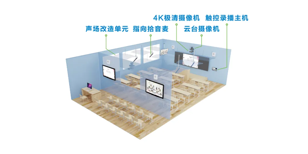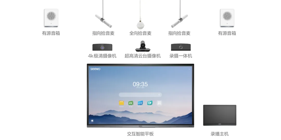 針對學校對精品教學資源的錄制需求,希沃研發了輕量化精品錄播方案——觸控錄播主機+4K極清攝像機+超高清機械云臺攝像機+指向拾音麥克風。該方案為教師提供更優質的精品課堂錄制環境。