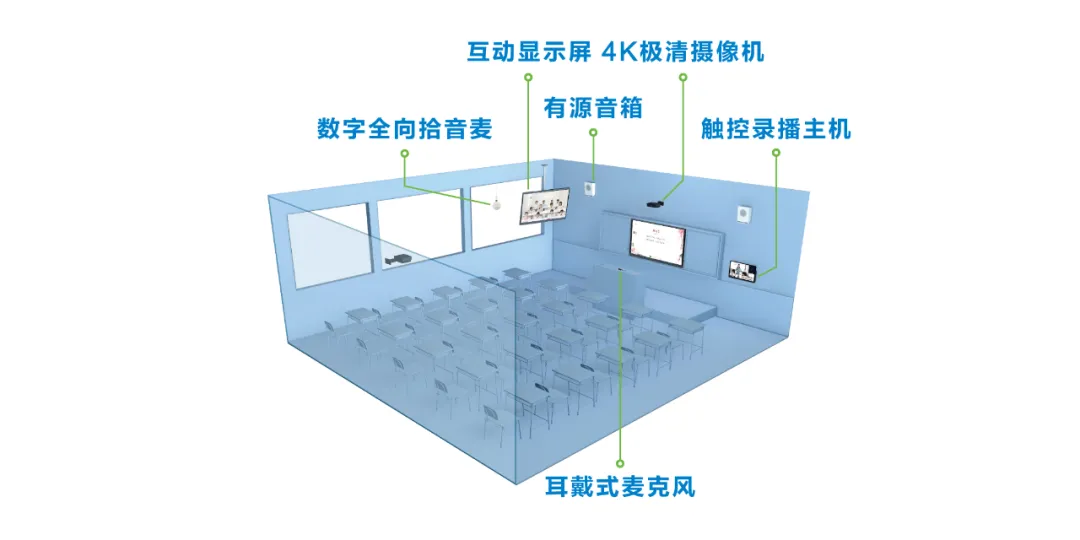 在性能上,錄播方案采用嵌入式系統設計,性能穩定。錄播主機內包含虛擬網段,可避免攝像機串頻。為了使墻面保持干凈美觀,希沃錄播的各硬件保持了一致的設計風格,形成墻面一體化。如此,攝像機、錄播主機等均為銀灰色,與大屏顏色相近,全向麥、指向麥均為白色,與天花板顏色相近,從色調到整體風格,均實現了統一。