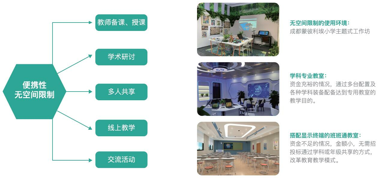 2021年,中教啟星推出“啟星VR移動(dòng)課堂”,依托便攜式虛擬現(xiàn)實(shí)設(shè)備,讓VR教育真正走進(jìn)教育深處,讓VR教育開(kāi)始無(wú)處不在。通過(guò)便攜式虛擬設(shè)備及3D、VR、AR互動(dòng)等技術(shù)的應(yīng)用,緊扣新課標(biāo),集成地理、歷史、數(shù)理化生、編程及AI課程、人體解剖、3D工作室及建模軟件、黨建、STEAM等數(shù)字VR教育資源,將教育、教學(xué)中的難點(diǎn)直觀、全景、多維度地呈現(xiàn)出來(lái),創(chuàng)設(shè)隨時(shí)隨地的學(xué)習(xí)環(huán)境,激發(fā)學(xué)習(xí)興趣,構(gòu)建核心素養(yǎng),可以在小學(xué)、初中、高中、職校、高校、青少年宮、科技館等教育領(lǐng)域廣泛應(yīng)用。同時(shí),VR移動(dòng)課堂兼顧教師備課、在線(xiàn)教學(xué)和教研需求,打破場(chǎng)景限制,創(chuàng)新教學(xué)模式,改善教學(xué)效果,并支持教師個(gè)人、年級(jí)組、學(xué)科組多人共享使用。