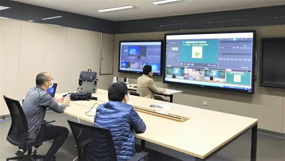 華南師大附中校領(lǐng)導(dǎo)在集控中心實(shí)時(shí)觀看名師直播教學(xué)情況