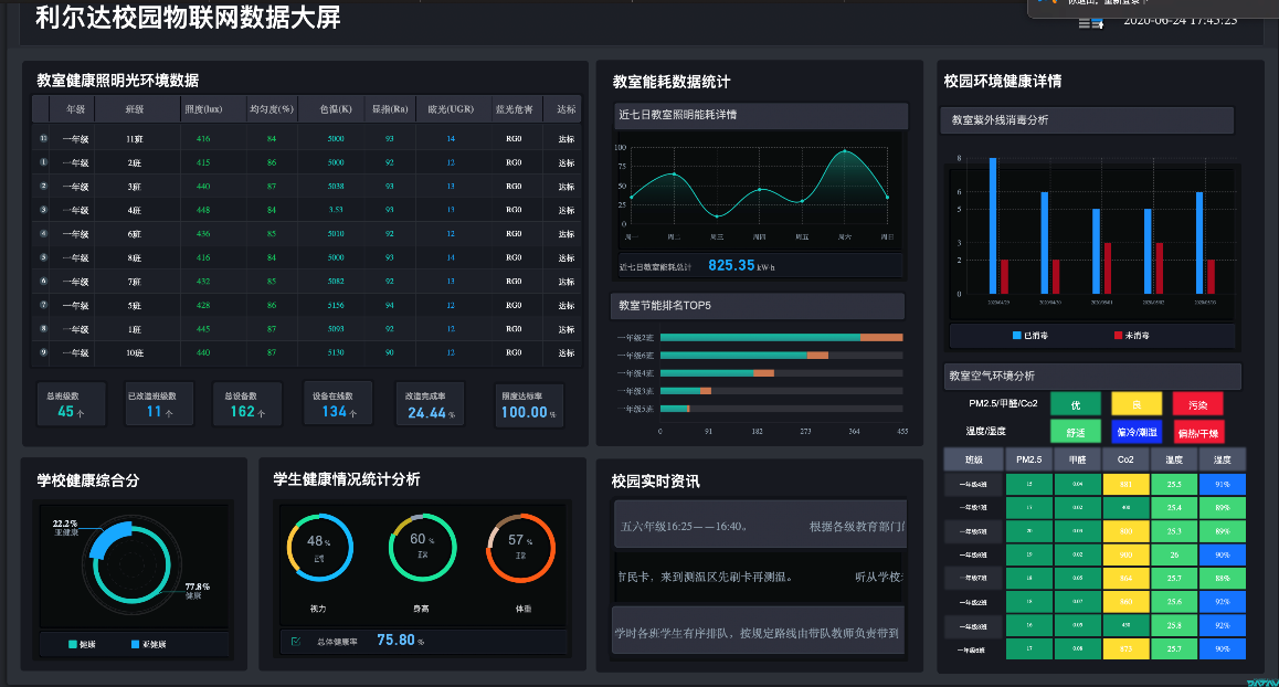 在此基礎(chǔ)上,利爾達(dá)發(fā)揮其多年來(lái)從事物聯(lián)網(wǎng)產(chǎn)品研發(fā)的技術(shù)優(yōu)勢(shì),在不增加布線的情況下,輕松實(shí)現(xiàn)教室內(nèi)的場(chǎng)景智能化,上課、自習(xí)、投影、晴天、陰雨天、夜間等不同場(chǎng)景對(duì)應(yīng)不同的光環(huán)境。通過(guò)教室內(nèi)的傳感器和智能化系統(tǒng),實(shí)現(xiàn)了教室內(nèi)的光照度隨著室外環(huán)境的變化而相應(yīng)的變化,始終保持課桌面具有較好的健康照度,學(xué)生長(zhǎng)時(shí)間在這樣的光環(huán)境中學(xué)習(xí),眼睛更為舒適。教室內(nèi)可通過(guò)傳感器監(jiān)測(cè)室內(nèi)的溫濕度、甲醛、PM2.5、二氧化碳濃度等數(shù)據(jù),并與教室內(nèi)其他設(shè)備形成聯(lián)動(dòng)。比如上課時(shí)如果二氧化碳濃度過(guò)高,此時(shí)學(xué)生在這樣的環(huán)境下上課,容易犯困,當(dāng)系統(tǒng)檢測(cè)濃度過(guò)高時(shí),會(huì)自動(dòng)開啟新風(fēng)系統(tǒng),沒(méi)有新風(fēng)系統(tǒng)的教室會(huì)給上課老師一個(gè)提醒——開啟窗戶通風(fēng),從而使學(xué)生保持精神飽滿狀態(tài)和保持良好坐姿,提高學(xué)習(xí)效率同時(shí)有效的防控近視。