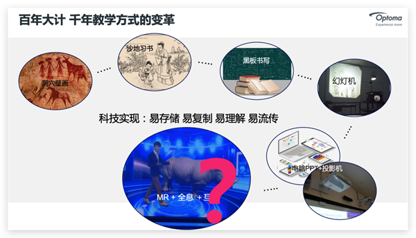 我們先來看一張演變圖,遠古時期人類靠在山體洞穴壁畫等物體上通過硬物擊打,雕琢,用原始的圖案傳遞和表達;之后就有了竹簡,沙地習書等等;發展到了我們熟悉的板書,這個時期已成了很普及很廣泛的受教方式,但不可避免的是相同的課件內容和信息傳授都無法重復利用,耗時耗力;幻燈機的出現改善了相同教案重復利用;再到后來,pc結合投影機的出現,成了現代教學的主導;那接下來,今后的教學方式又將發生怎樣的革新?