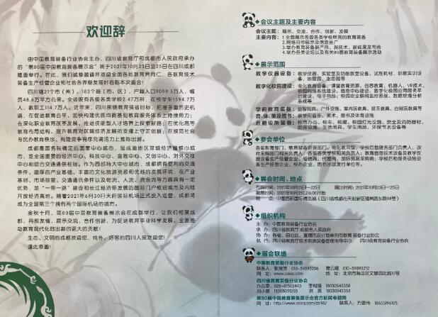 由中國教育裝備行業協會主辦,四川省教育廳和成都市人民政府承辦的“第80屆中國教育裝備展示會”將于2021年10月23日至25日在四川成都隆重舉行。在此,我們誠摯邀請并歡迎全國各地教育界同仁,各教育技術裝備生產經營企業和社會各界朋友屆時蒞臨本次盛會!