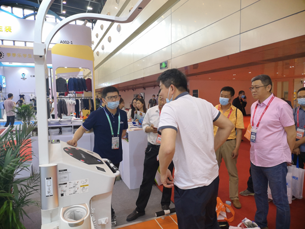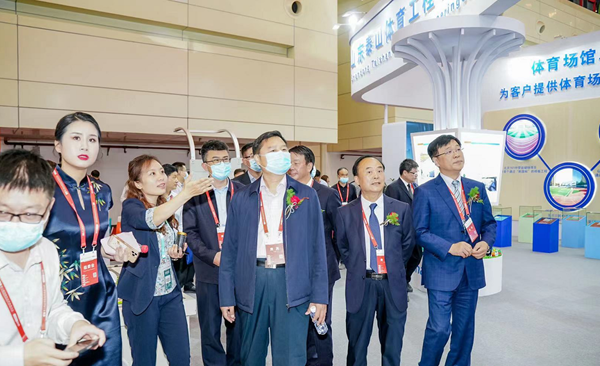展會現場,中國教育裝備行業協會副會長夏國明、山東省教育技術裝備服務中心主任魏光祥在泰山體育工程副總經理尹舒毅的陪同下,參觀泰山體育工程展位。