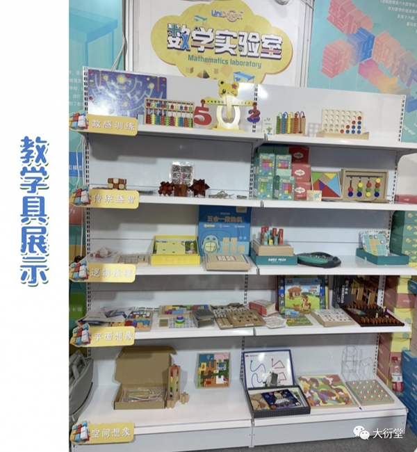 在本次大衍堂展位中,我們搭建展出了創(chuàng)新數(shù)學(xué)教育研發(fā)設(shè)計的教學(xué)產(chǎn)品和服務(wù)。從“數(shù)學(xué)實驗室”場景的文化墻設(shè)計、空間營造、掛圖和模型展示,到沙盤桌等硬件教具設(shè)施,并將課程配套學(xué)具以數(shù)學(xué)價值進(jìn)行分類展示。