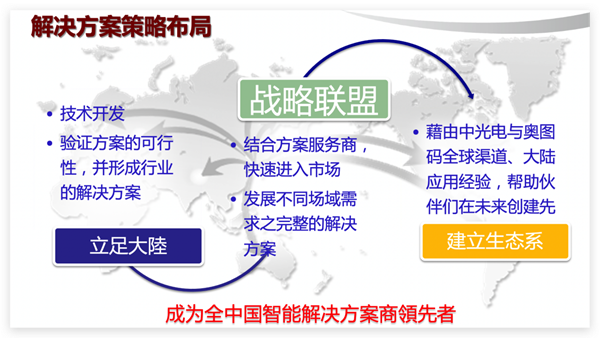 大會首先由中光電集團總經理吳秀蕙女士上臺致辭并帶來演講,從集團1992年的創立到今天的輝煌,以及“全球布局,中國領頭”的期許,同時為我們介紹集團在智能顯示產品策略——硬體產品(規模化,成本導向)到技術創新(影像技術,光學技術)再到專業領域應用(客制化,服務導向);同時勾繪出AI+解決方案策略地圖,既有科技(光,機,電,熱)衍生+技術革新=行業應用解決方案;從解決方案策略布局,我們興奮得看到集團的愿景“成為全中國智能解決方案商領導者”,讓我看到中光電集團對中國市場的重視和對未來發展的決心。