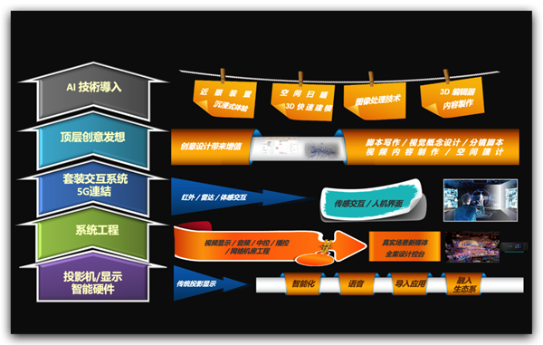 從投影機/顯示智能硬件(智能化/語音/導入應用/融入生態系)到 系統工程(視頻顯示/音頻/中控/播控/網絡機房工程,真實場景新媒體全案設計控臺)到 套裝交互系統5G連結(紅外/雷達/體感交互,傳感交互/人機界面)再到 頂層創意發想(創意設計帶來增值,腳本寫作/視覺概念設計/分鏡腳本視頻內容制作/空間譳計) 接下來進入AI技術導入(近眼裝置/沉浸體驗,空間掃描/3D快速建模,圖像處理技術,3D編輯器/內容制作)。這份策略藍圖讓我們清晰地看出奧圖碼邁入科技行業新紀元,正快速有序地布局,研發,創新,一條科技巨龍必將在不久直上云霄,傲視群雄。