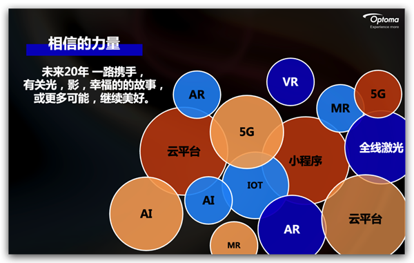 接下來,整個演講貫穿主題思路“穿越 沉浸 融合”,為大家指點江山,規劃未來!“Optoma provides Big Image solution奧圖碼提供大型顯示方案的增值服務”,奧圖碼兌現2019許下的承諾,如今,以更加堅定的信念和無比自信心規劃未來藍圖。
