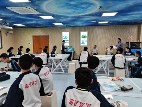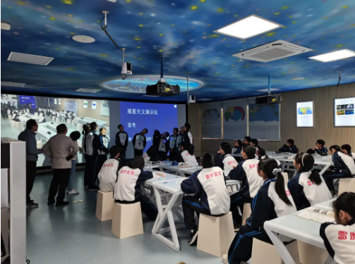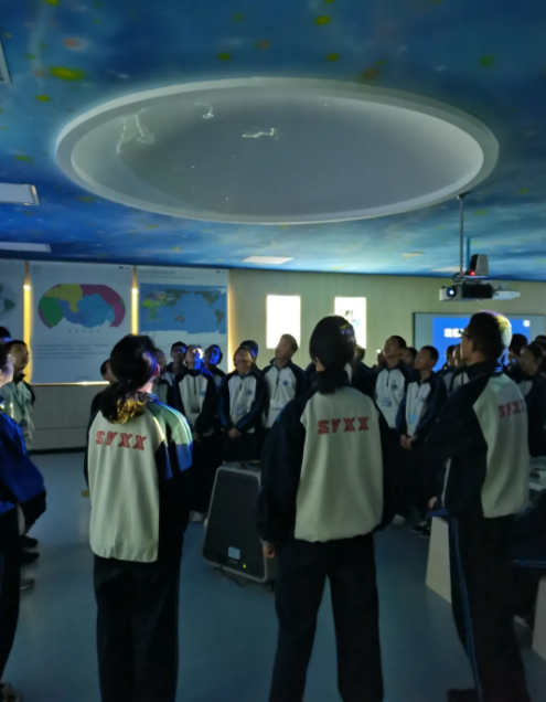 天文演示儀在天花板上投影出一個圓形的演示穹頂。將學生的視角由地球范疇,轉向太空乃至整個宇宙,將地理知識與天文教學有效整合。觀看天文演示儀,同學們既能了解麥哲倫航行的路線,又能看到指路的星星;既找到了答案,又對宇宙產生了濃厚的興趣。