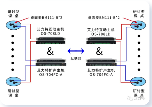 艾力特通過詳細的方案設計與產品搭配,為客戶創造性的提供了新型智慧教室音頻方案。在新型智慧教室中,六組學員可以實現獨立的發言擴聲,分組辯論擴聲,教師擴聲,并且教室之間可以通過網絡鏈接拓展為更大的虛擬教室,實現異地教室之間的同步教學。艾力特新型智慧教室音頻方案,進一步拓展了傳統的網絡課堂模式,使全員課堂互動成為可能,豐富了智慧教室的課堂授課形式。