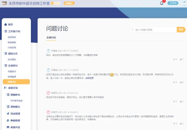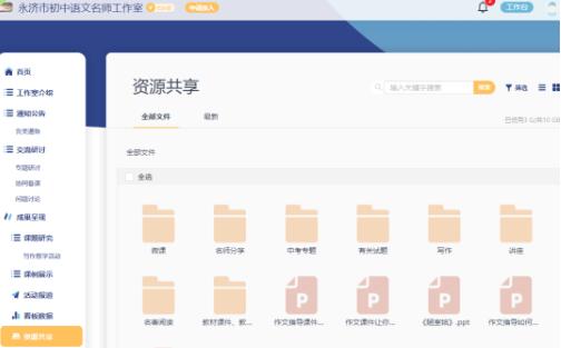 在空間里,各位名師圍繞研修主題發起的研修通知、專題討論、活動設計、案例分享以及成果展示等過程性資料都會在空間進行保存。資源共享模塊中展示了成果型教學資源,包含文檔、PPT、視頻等各種格式,區域教師只需登錄個人空間便可下載觀摩學習,有效促進了校級資源、校本資源以及區域資源的生成共享。