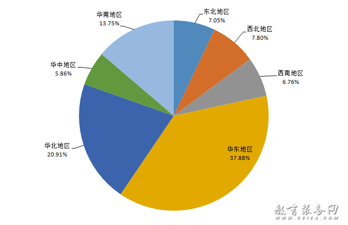 根據(jù)5月份收集到的教育裝備招標(biāo)采購(gòu)信息(見(jiàn)圖2、圖3):教育裝備招標(biāo)采購(gòu)區(qū)域信息數(shù)據(jù)共3448條(招標(biāo)采購(gòu)信息地區(qū)設(shè)置為單選項(xiàng))。其中,華東地區(qū)招標(biāo)采購(gòu)信息量1306條,占區(qū)域信息量的37.88%;華北地區(qū)招標(biāo)采購(gòu)信息量721條,占區(qū)域信息量的20.91%;華南地區(qū)招標(biāo)采購(gòu)信息量474條,占區(qū)域信息量的13.75%;西北地區(qū)招標(biāo)采購(gòu)信息量269條,占區(qū)域信息量的7.80%;東北地區(qū)招標(biāo)采購(gòu)信息量243條,占區(qū)域信息量的7.05%;西南地區(qū)招標(biāo)采購(gòu)信息量233條,占區(qū)域信息量的6.76%;華中地區(qū)教育裝備招標(biāo)采購(gòu)信息量均為202條,占區(qū)域信息量的5.86%。