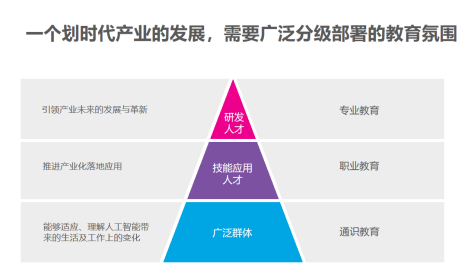 鐘永認為,“一個劃時代產業的發展,需要廣泛分級部署的教育氛圍!贬槍V泛群體、技能應用人才和研發人才這三類人才梯隊,優必選科技打造了從K12到高校的貫通式培養體系,分層部署,用通識教育培養能夠適應及理解人工智能時代變化的青少年人才、用職業教育培養能推進產業化落地應用的技能型人才、用專業教育培養引領產業未來的發展與革新的科研人才。
