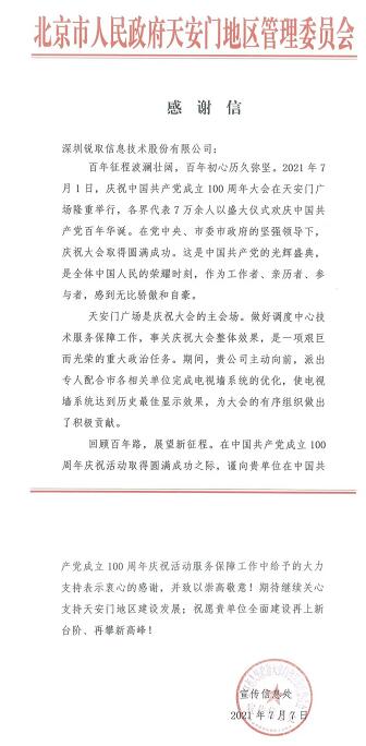 深耕政企全場景視訊服務多年的深圳銳取,多年來深獲行業用戶的肯定與贊譽,在這場百年盛典上,銳取以領先行業的核心技術,完美保障了“慶祝中國共產黨成立100周年大會”的圓滿成功!