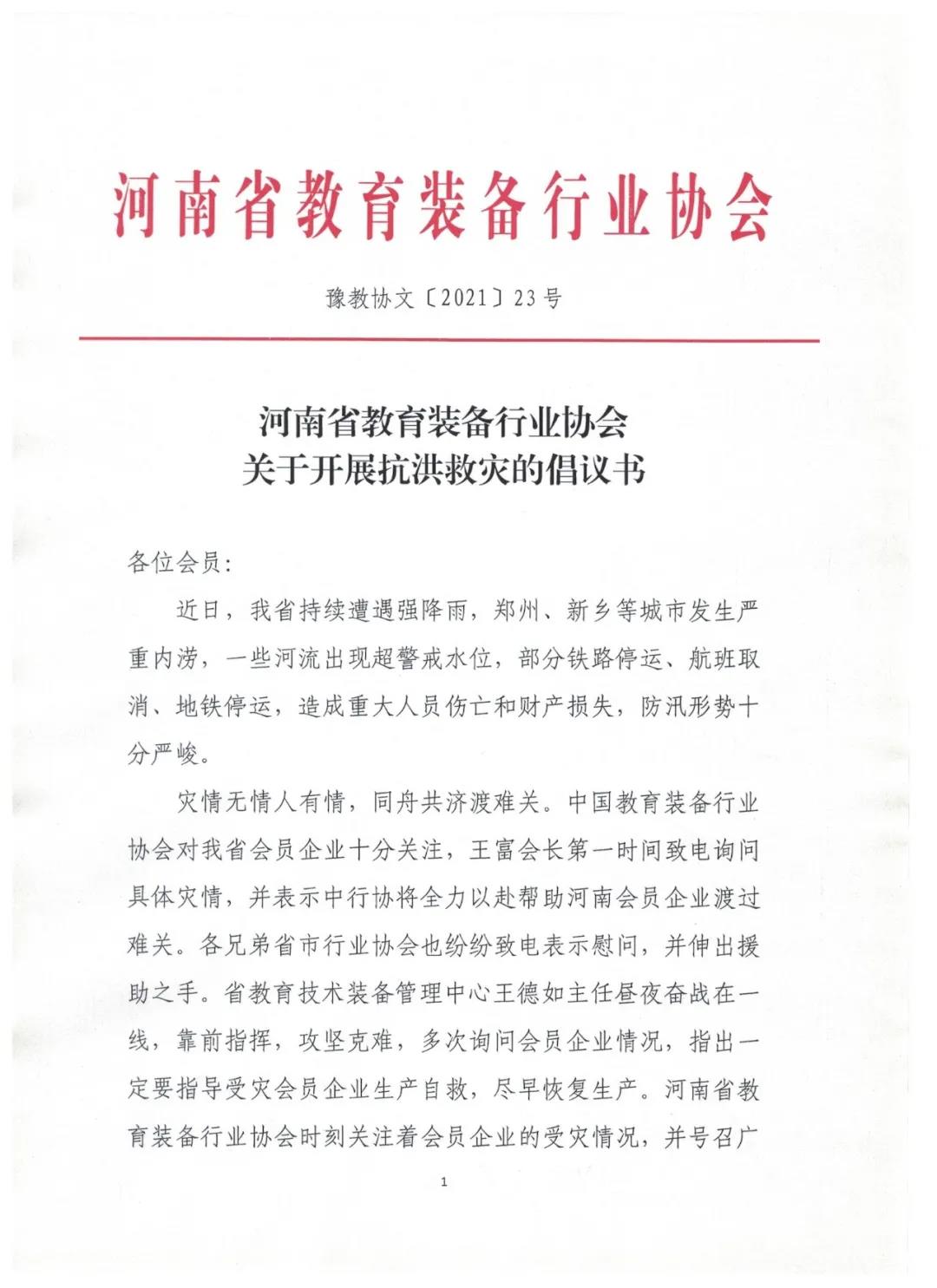 河南省教育裝備行業(yè)協(xié)會關(guān)于開展抗洪救災的倡議書