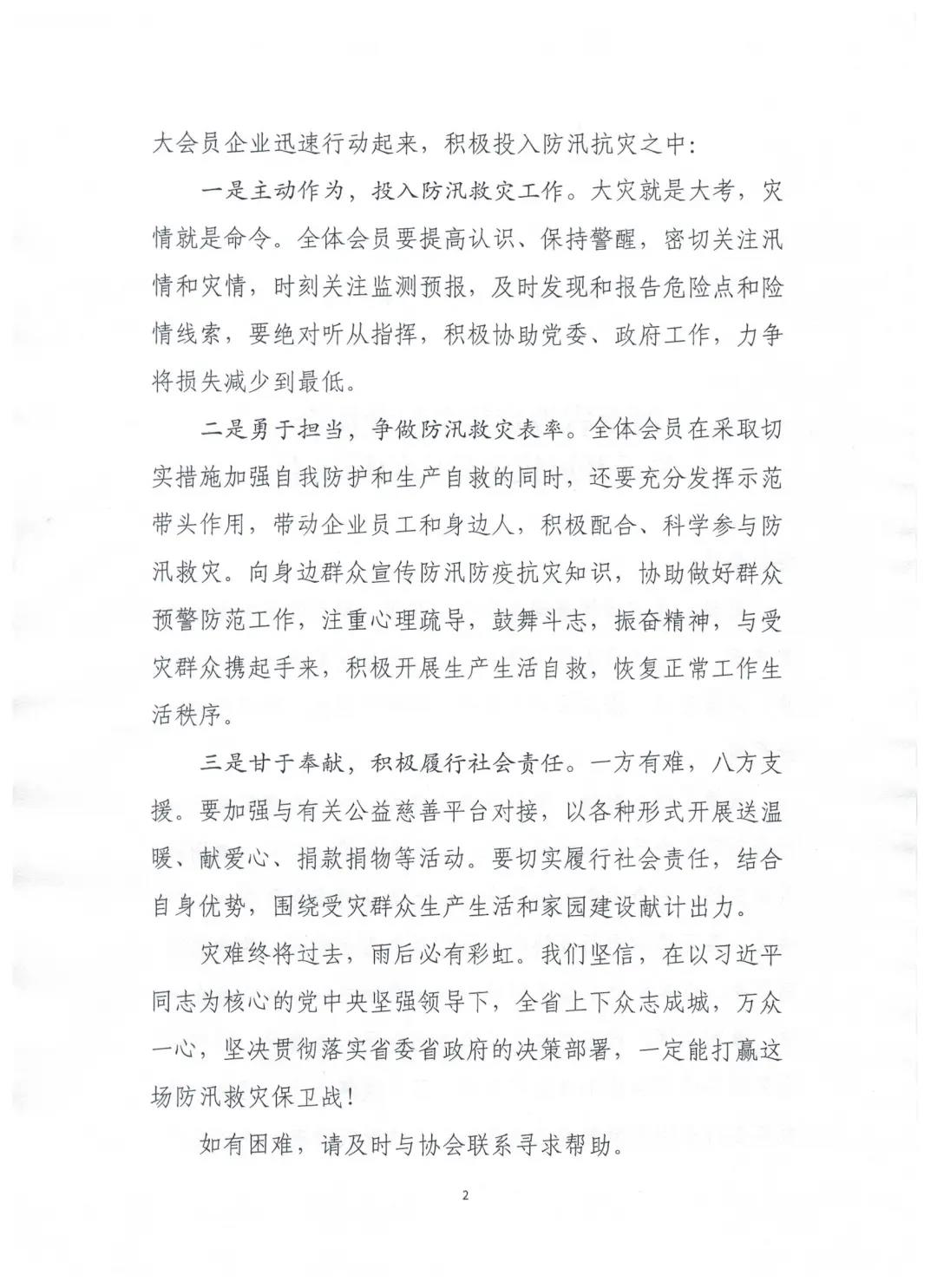 二是勇于擔當,爭做防汛救災表率。全體會員在采取切實措施加強自我防護和生產(chǎn)自救的同時,還要充分發(fā)揮示范帶頭作用,帶動企業(yè)員工和身邊人,積極配合、科學參與防汛救災。向身邊群眾宣傳防汛防疫抗災知識,協(xié)助做好群眾預警防范工作,注重心理疏導,鼓舞斗志,振奮精神,與受災群眾攜起手來,積極開展生產(chǎn)生活自救,恢復正常工作生活秩序。
