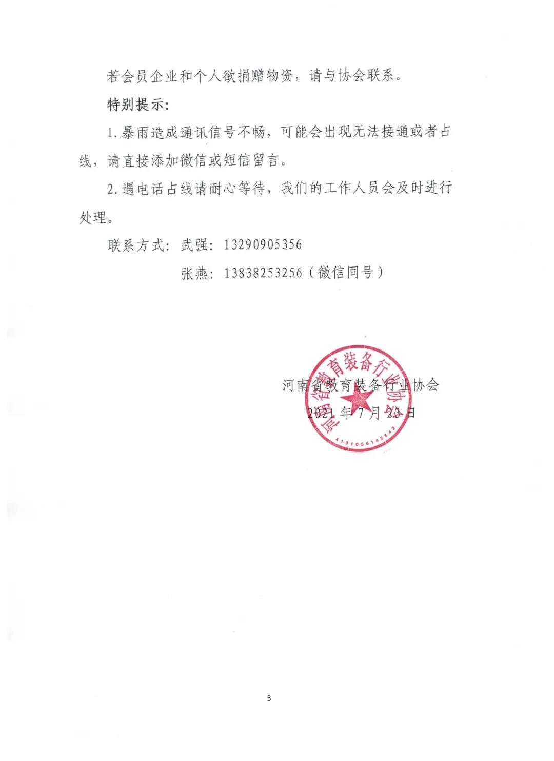 災情無情人有情,同舟共濟渡難關(guān)。中國教育裝備行業(yè)協(xié)會對我省會員企業(yè)十分關(guān)注,王富會長第一時間致電詢問具體災情,并表示中行協(xié)將全力以赴幫助河南會員企業(yè)渡過難關(guān)。各兄弟省市行業(yè)協(xié)會也紛紛致電表示慰問,并伸出援助之手。省教育技術(shù)裝備管理中心王德如主任晝夜奮戰(zhàn)在一線,靠前指揮,攻堅克難,多次詢問會員企業(yè)情況,指出一定要指導受災會員企業(yè)生產(chǎn)自救,盡早恢復生產(chǎn)。河南省教育裝備行業(yè)協(xié)會時刻關(guān)注著會員企業(yè)的受災情況,并號召廣大會員企業(yè)迅速行動起來,積極投入防汛抗災之中: