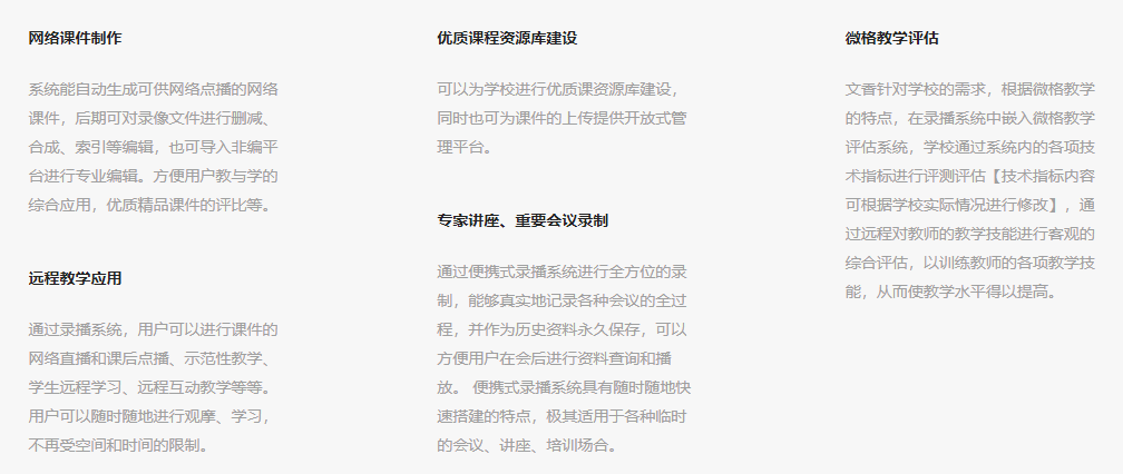 互聯網、人工智能、大數據、5G等技術迅猛發展對教育教學帶來重大影響,文香積極應用新的信息技術,創新教學組織模式、改善學習環境、發展數字化教育資源、加快智慧化學習環境建設與應用、 提升信息化教學創新能力、促進信息技術與教學深度融合,文香整合自身強大技術優勢,組織研發了無線便攜式錄播系統,在此基礎上文香推出了便攜式錄播建設方案,采用全無線傳輸技術,3分鐘完成搭建,讓錄播真正實現移動隨行,不再受場地環境限制。實現優質課程資源制作與轉播、學術視頻演示與會議、課程視頻大規模直播、遠程教育等教學應用。