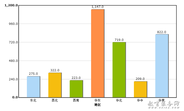 根據6月份收集到的教育裝備招標采購信息(見圖2、圖3):教育裝備招標采購區域信息數據共3717條(招標采購信息地區設置為單選項)。其中,華東地區招標采購信息量1147條,占區域信息量的30.86%;華南地區招標采購信息量822條,占區域信息量的22.11%;華北地區招標采購信息量719條,占區域信息量的19.34%;西北地區招標采購信息量322條,占區域信息量的8.66%;東北地區招標采購信息量275條,占區域信息量的7.40%;西南地區招標采購信息量223條,占區域信息量的6.00%;華中地區教育裝備招標采購信息量均為209條,占區域信息量的5.62%。