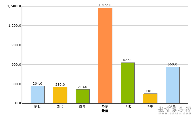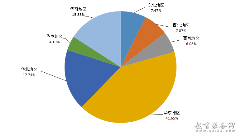 6月份教育裝備中標采購區域信息數據共3534條(中標信息區域設置為單選項)見圖6、圖7,華東地區中標信息量1472條,占區域信息量的41.65%;華北地區中標信息量627條,占區域信息量的17.74%;華南地區中標信息量560條,占區域信息量的15.85%;東北地區教育裝備中標信息量264條,占區域信息量的7.47%;西北地區中標信息量250條,占區域信息量的7.07%;西南地區中標信息量213條,占區域信息量的6.03%;華中地區中標信息量148條,占區域信息量的4.19%。