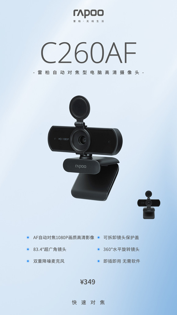 近日,領(lǐng)軍國產(chǎn)外設(shè)品牌,實(shí)力大廠上市企業(yè)Rapoo雷柏,推出了首款帶有AF自動(dòng)對焦型的電腦高清攝像頭——C260AF,AF自動(dòng)對焦1080P畫質(zhì)的高清影像,83.4°超廣角鏡頭,雙重的降噪麥克風(fēng),可拆卸的攝像頭隱私保護(hù)蓋,360°水平旋轉(zhuǎn)鏡頭等,為你開啟視頻互動(dòng)的高清狂潮。