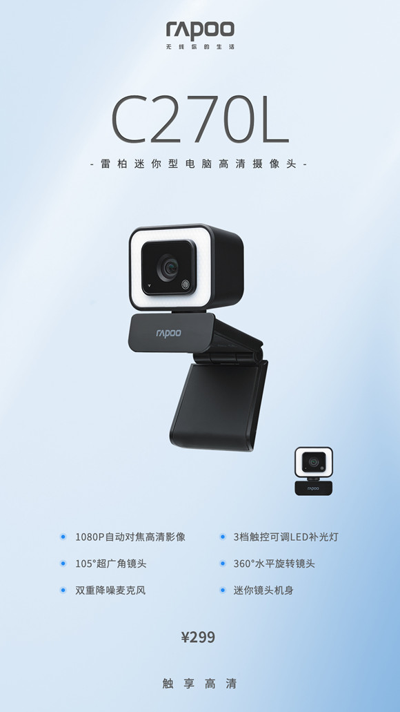 近日,領軍國產外設品牌,實力大廠上市企業Rapoo雷柏,推出了C270L迷你型電腦高清攝像頭,1080P的自動對焦高清影像,105°的超廣角鏡頭,3檔觸控可調的LED補光燈,雙重降噪麥克風,360°的水平旋轉鏡頭,再加上迷你的鏡頭機身,隨時隨身便捷攜帶,為你開啟便捷的直播互動狂潮。