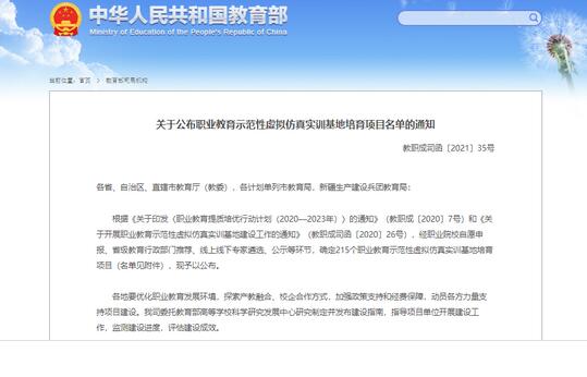 近日,教育部也正式發(fā)布《關(guān)于公布職業(yè)教育示范性虛擬仿真實訓(xùn)基地培育項目名單的通知》(教職成司函〔2021〕35號),公布215個職業(yè)教育示范性虛擬仿真實訓(xùn)基地培育項目名單。
