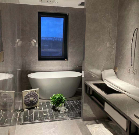 洗漱間同樣利用筒射燈對洗漱臺、浴缸等地點對點照明,分隔不同功能區域;利用燈帶照亮臺下,驅散暗角,提升洗漱臺整體視覺亮度。