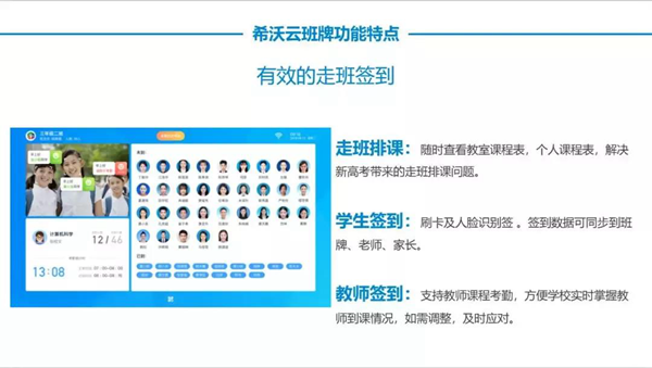 希沃云班牌不僅能夠展示校園文化,還能夠解決新高考政策后高中學校面臨的走班排課等教學管理問題。通過希沃云班牌,師生可實現刷臉或佩戴不同的智能配件刷卡簽到,即使在不同班級也能登錄個人頁面,查看選課內容、課程安排與出勤情況等信息。希沃云班牌還能幫助學校精準掌握學生學習情況,對走班條件下的學校考勤、信息發布查詢、教學管理等實行更加全面的信息化管理。