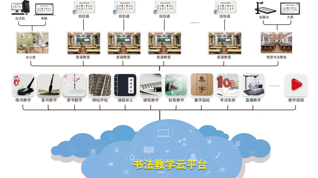 漢丹云智慧書法云教室依托行業(yè)領(lǐng)先的云平臺構(gòu)建書法云服務(wù),讓學(xué)校所有教室都可以開展書法教學(xué)工作,解決學(xué)校教室緊張、排課困難和師資緊缺等多方面問題。書法專用教室在日常教學(xué)排課中,存在資源緊張,排課困難的情況,很難保證每個學(xué)生的課時安排;同時書法課除保證日常教學(xué)外,為達到好的教學(xué)效果,還需為學(xué)生提供額外的書法練習(xí)課,所以書法專用教室完全不能滿足日常教學(xué)使用。因此,將依據(jù)互聯(lián)網(wǎng)+教育理念打造網(wǎng)絡(luò)化的智慧書法教室,接入書法教學(xué)云平臺,讓所有教室都可以開展書法教學(xué)工作,解決書法功能教室排課緊張問題;師生可以在校園任何接入網(wǎng)絡(luò)的設(shè)備上都可登陸書法云平臺開展書法教學(xué)工作,賦能書法課堂和校園內(nèi)外,讓教學(xué)工作不受制于課堂。