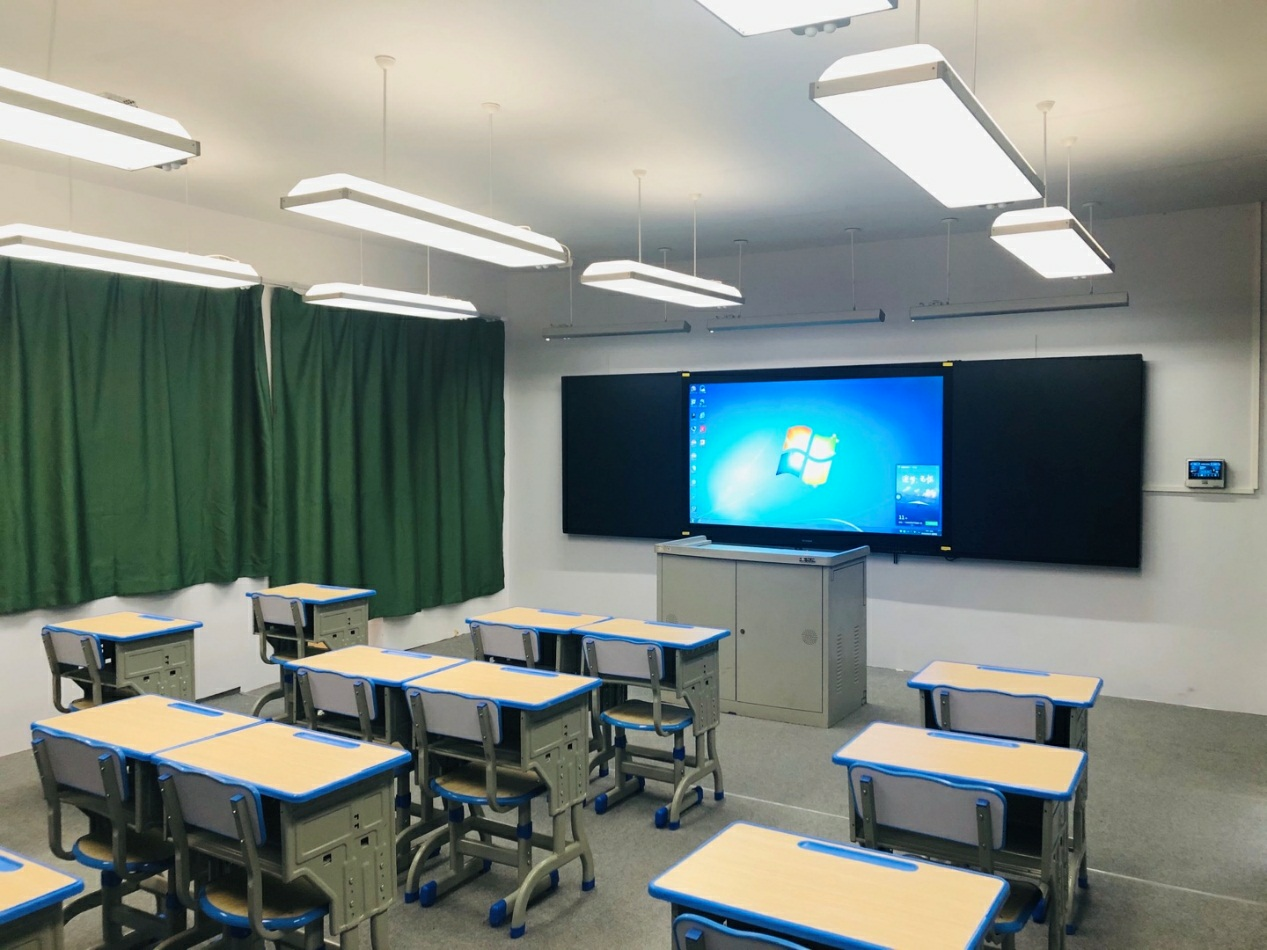 優視春全護眼調光燈,在優視春全護眼普通燈基礎上,增加了調光控制器、調光軟件等設備。提供6種不同場景的照明模式:上課模式、多媒體模式、課間模式、自習模式、考試模式、放學模式,可一鍵調控。讀寫模式:教室燈光照度調節至300LX以上,黑板燈自動調節至500LX以上,健康護眼。課件模式:燈光調弱,便于學生課間休息。多媒體模式:教室燈光照度自動調節至50-100LX,黑板燈自動調節至50LX以下。該款產品也可以手動0-100%調節燈光強弱。