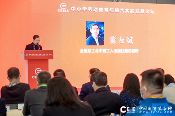 2021年10月24日上午,以“勞動育人 實踐成才”為主題的中小學勞動教育與綜合實踐發展論壇舉辦。本次論壇由中國教育裝備行業協會主辦,中國教育裝備行業協會創造教育分會、中國教育裝備行業協會綜合實踐與勞動教育基地(營地)工作委員會、中國科普產學研創新平臺承辦,系第80屆中國教育裝備展示會活動之一。