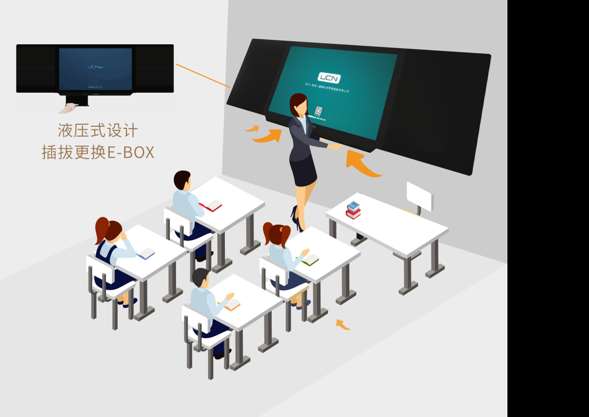 Box設計,將視頻卡、OPS等易損部件全部集成在一個小盒子里,如果出現故障,只需直接拉出更換備份E-Box。無需等待上門維修服務,不耽誤學校正常教學活動。