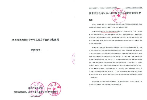 北京大學醫(yī)學部、北京大學兒童青少年衛(wèi)生研究所(國標GB7793-2010《中小學校教室采光和照明衛(wèi)生標準》、國標GB40070-2021《兒童青少年學習用品近視防控衛(wèi)生要求》主起草單位)出具的權威報告顯示:立達信健康光環(huán)境改造項目顯著提升了教室的照明環(huán)境,在一定程度上可預防中小學生視力下降和降低不良視力的新發(fā)率。根據與對照校不同學齡學生的近視不良率對比,改造校學生的近視率下降5.9-33.3%不等。