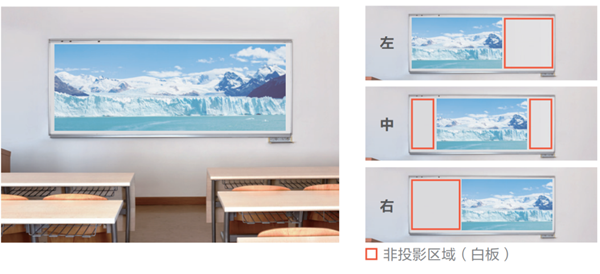 L730U系列支持16:6寬屏模式,最大屏幕尺寸可達452英寸,并且可以通過遙控器調(diào)整屏幕位置,這樣可以留出非投影區(qū)域,用戶可以在無影像區(qū)域進行板書書寫。
