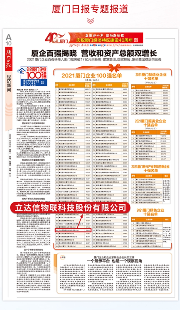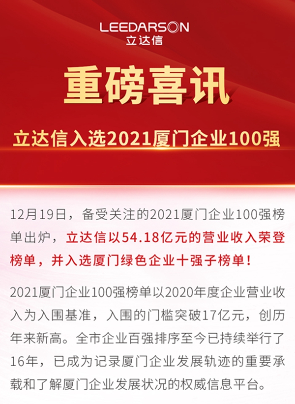 54.18億元!立達信入選2021廈門企業100強、廈門綠色企業十強!