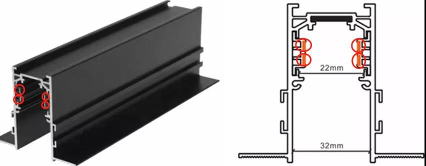 二、三線類似,都為單回路控制(同一導軌上燈具只能統一開關,不能分開控制),不同在于二線導軌內置1零1火二線(地線一般外置于導軌條),三線導軌地線變成了導軌內部的設計,故導軌內有1零1火1地三線,因此部分專業技術人員,在面對特殊應用要求,也存在將三線導軌地線公用為零線,改造成兩回路,實現分回路控制的情況(注:不建議自行改造行為)。