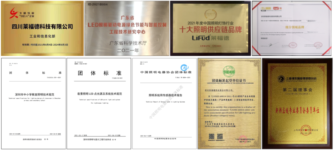 2021年,萊福德受邀起草編訂7項團體/行業標準(已正式發布執行4項),助力行業統一發展,并榮獲國家級“專精特新”小巨人企業、廣東工程技術中心、中國照明燈飾行業“十大照明供應鏈品牌”等榮譽稱號。