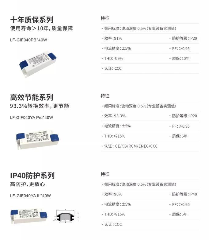 ·恒流AAB調光&ABB雙色溫、恒壓GAB調光(B)&調光調色(A)電源:四大類別12個型號近百款標準參數,可滿足不同燈具需求