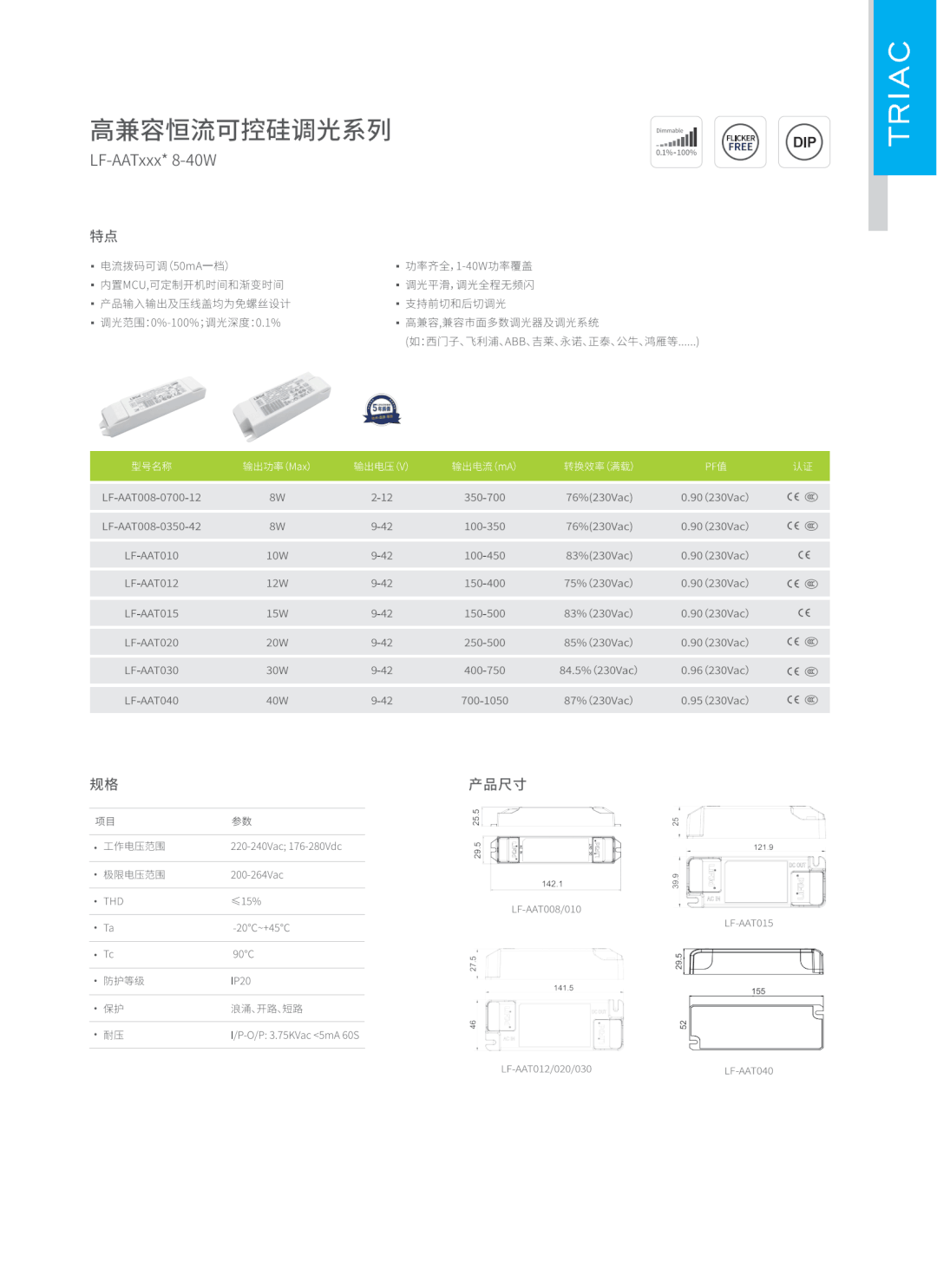 ·AAT恒流調光電源:兼顧體積、認證與性能,內置MCU具有超高兼容性,兼容市面主流調光系統,小眾調光系統也可通過測試調整曲線實現兼容。