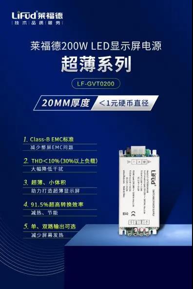 萊福德顯示屏電源重點新品,產品厚度僅為20mm,可助力廣大客戶打造超薄輕巧的顯示屏箱體,輕松實現壁掛貼墻安裝。
