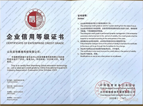 山東啟華連續(xù)多年榮獲教育裝備行業(yè)企業(yè)信用等級評價A級,積極踐行企業(yè)誠信自律,提升信用風(fēng)險防范能力,推動行業(yè)信用體系建設(shè)。