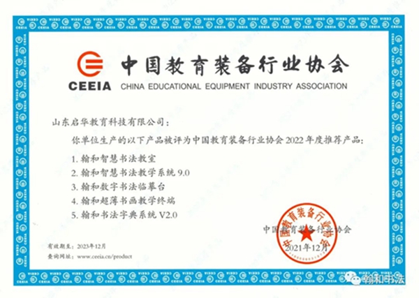 山東啟華翰和智慧書法教室系列,憑借優(yōu)秀的產(chǎn)品品質(zhì)和良好的用戶口碑,連續(xù)多年獲評中國教育裝備行業(yè)協(xié)會推薦產(chǎn)品。