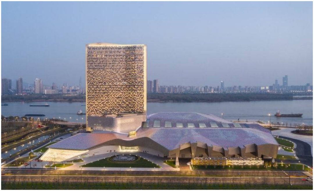 作為新區核心項目,會議中心被冠以“揚子江”之名,設計理念來源大江大河的層波疊浪:起伏的裙樓呼應了長江上的層波疊浪,泛光的鈦板屋頂反射著江面粼粼波光。高聳、開闊的塔樓仿佛江上穿梭的中式帆船,揚帆弄影、乘風 破浪。