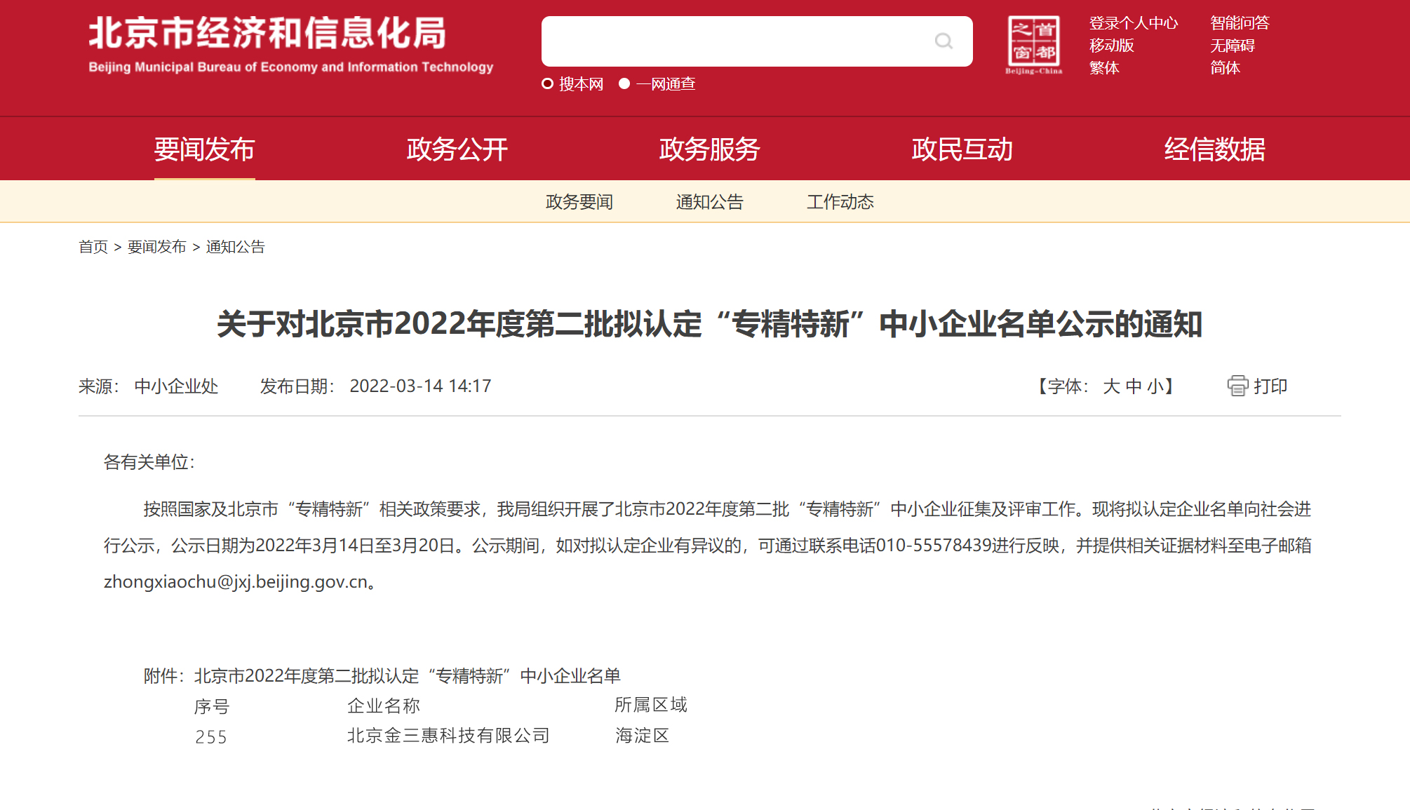 金三惠入選北京市2022年度第二批“專精特新”中小企業(yè)