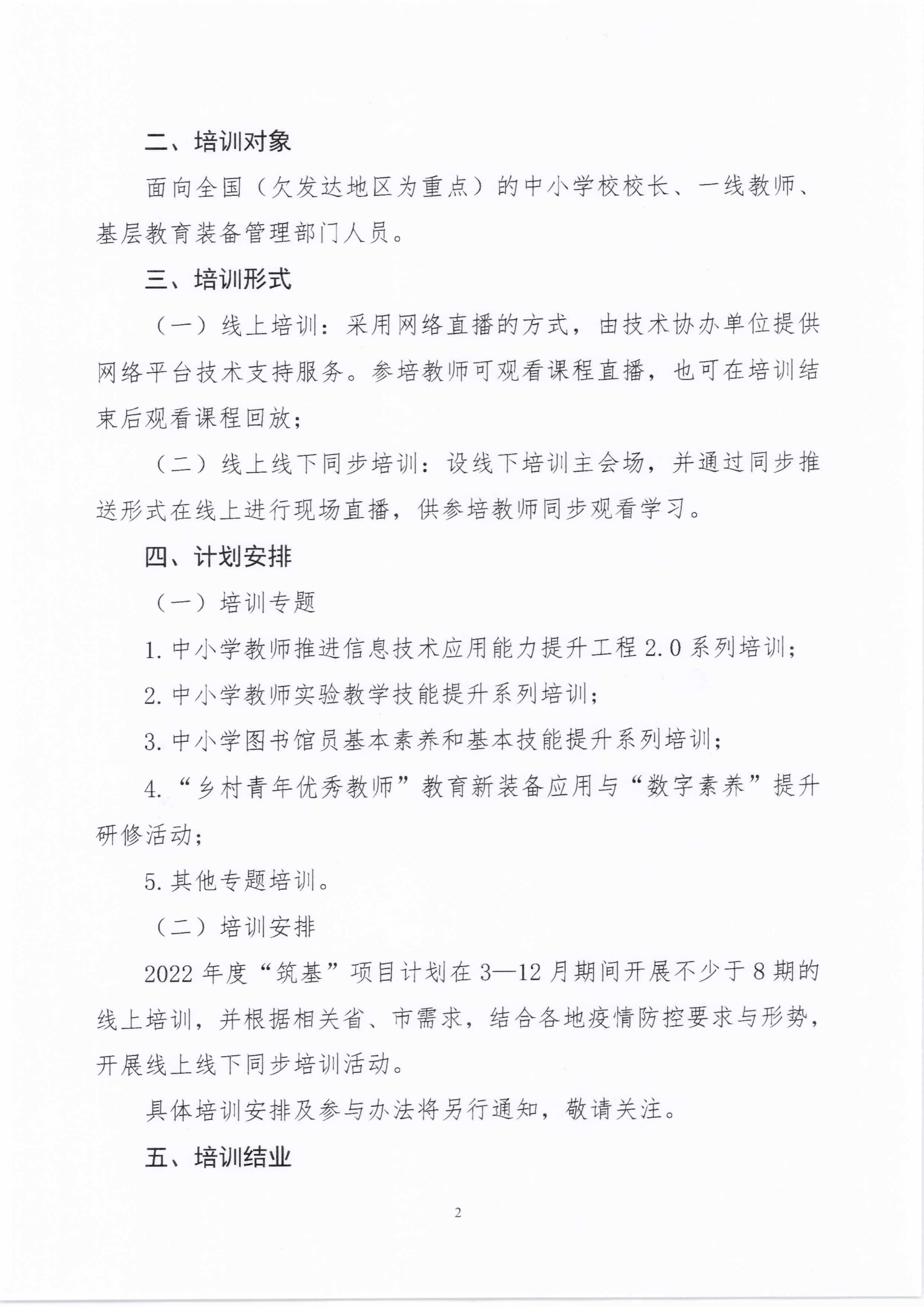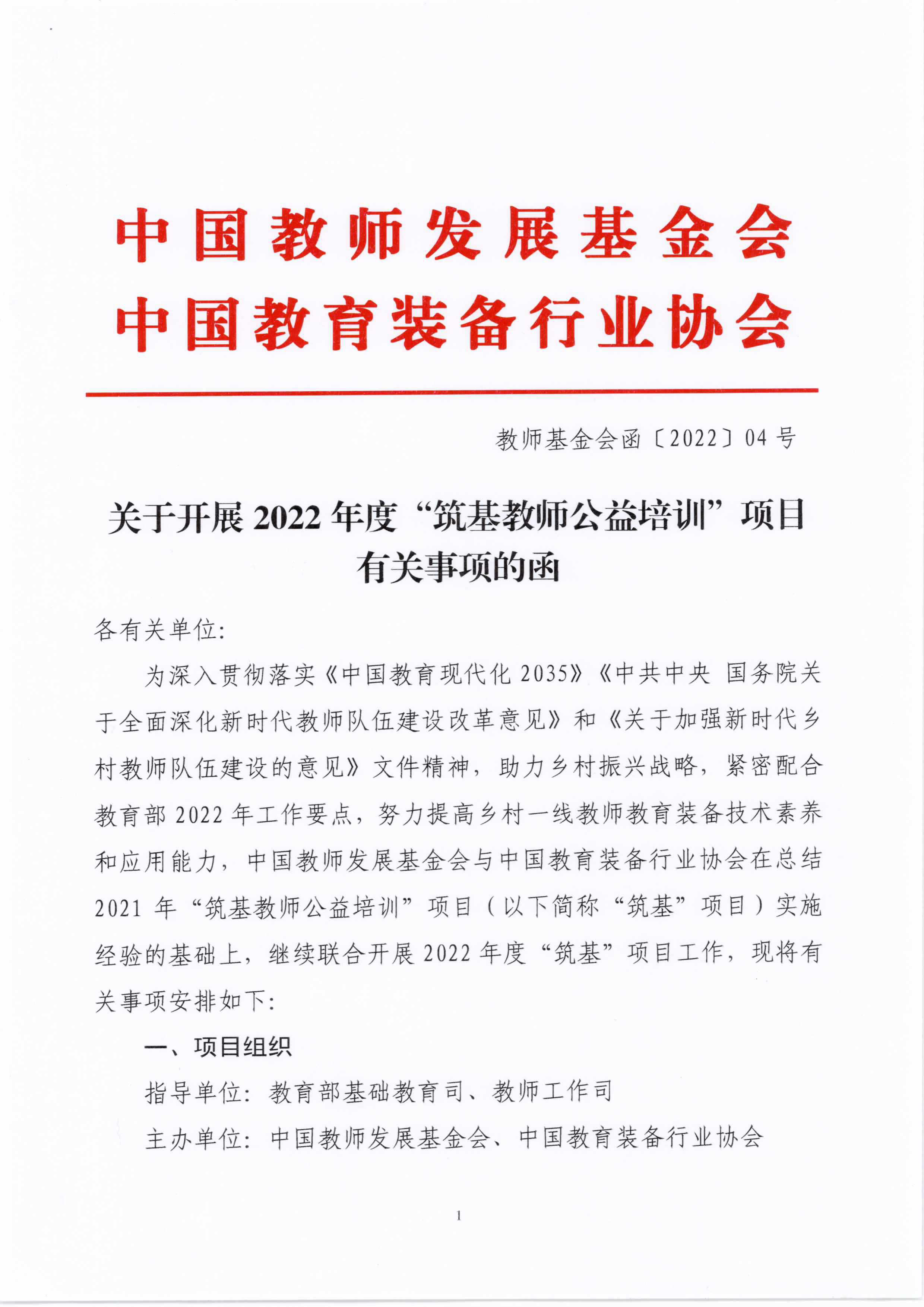為深入貫徹落實《中國教育現代化2035》《中共中央 國務院關于全面深化新時代教師隊伍建設改革意見》和《關于加強新時代鄉村教師隊伍建設的意見》文件精神,助力鄉村振興戰略,緊密配合教育部2022年工作要點,努力提高鄉村一線教師教育裝備技術素養和應用能力,中國教師發展基金會與中國教育裝備行業協會在總結2021年“筑基教師公益培訓”項目(以下簡稱“筑基”項目)實施經驗的基礎上,繼續聯合開展2022年度“筑基”項目工作,現將有關事項安排如下: