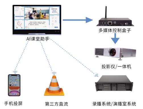 支持手機(jī)投屏,便于隨時(shí)投放課件;支持觀看錄播系統(tǒng),對接演播系統(tǒng)、錄播系統(tǒng)的直播信號,輕松實(shí)現(xiàn)校園電視臺;支持觀看第三方流媒體,無縫對接各種原有的視頻攝像器材、可利舊、不浪費(fèi)。