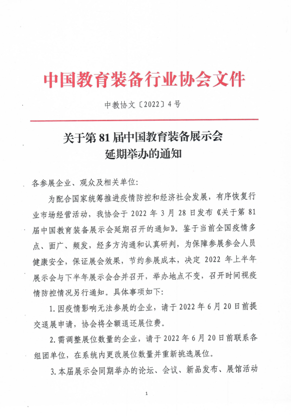 為配合國家統籌推進疫情防控和經濟社會發展,有序恢復行業市場經營活動,我協會于2022年3月28日發布《關于第81屆中國教育裝備展示會延期召開的通知》。鑒于當前全國疫情多點、面廣、頻發,經多方溝通和認真研判,為保障參展參會人員健康安全,保證展會效果,節約參展成本,決定2022年上半年展示會與下半年展示會合并召開,舉辦地點不變,召開時間視疫情防控情況另行通知。具體事項如下: