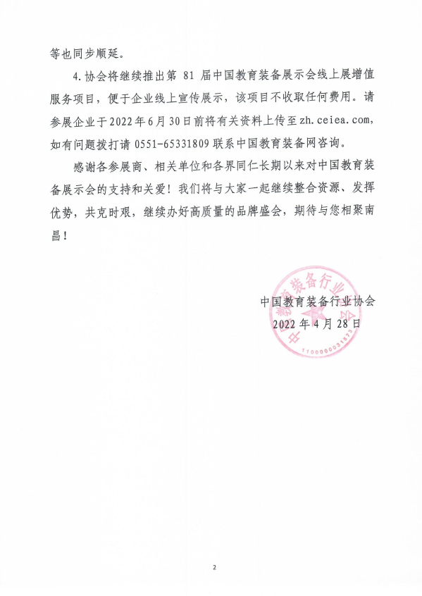 4.協會將繼續推出第81屆中國教育裝備展示會線上展增值服務項目,便于企業線上宣傳展示,該項目不收取任何費用。請參展企業于2022年6月30日前將有關資料上傳至zh.www.2776g.com,如有問題撥打請0551-65331809聯系中國教育裝備網咨詢。